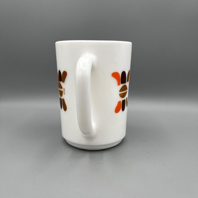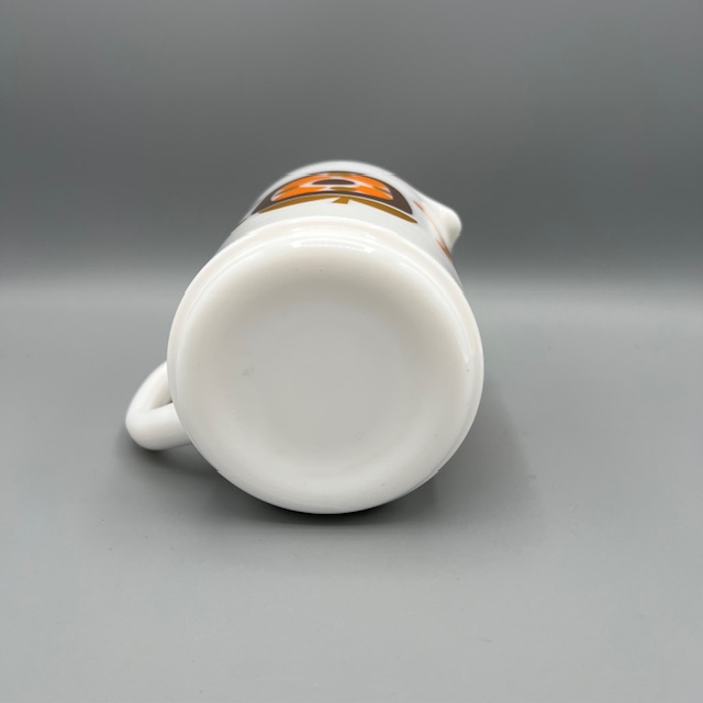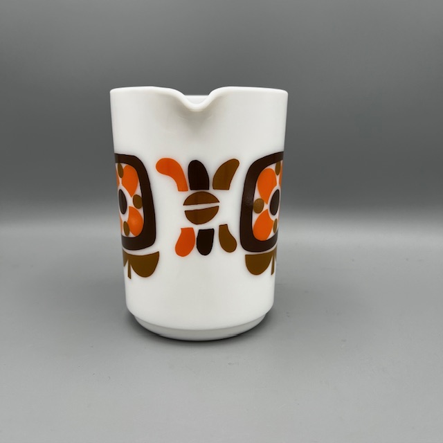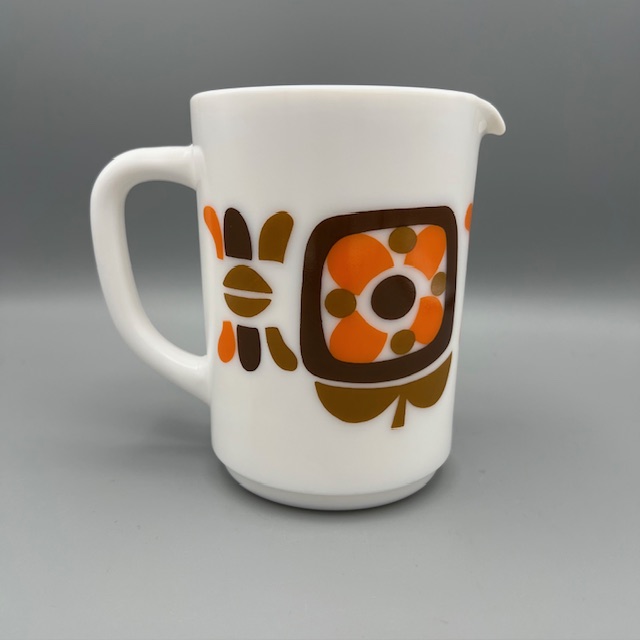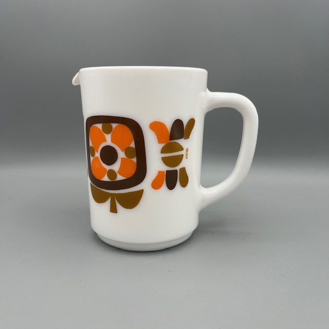 Pichet Arcopal Mobil. Le modèle date des années 70 . C’est le modèle iconique de la marque !!!! il est né de la collaboration entre la marque Arcopal et Mobil. En 1972, la société Mobil lance une opération marketing originale : offrir des mugs, des tasses et des pichets en échange de points collectés lors des pleins d’essence.