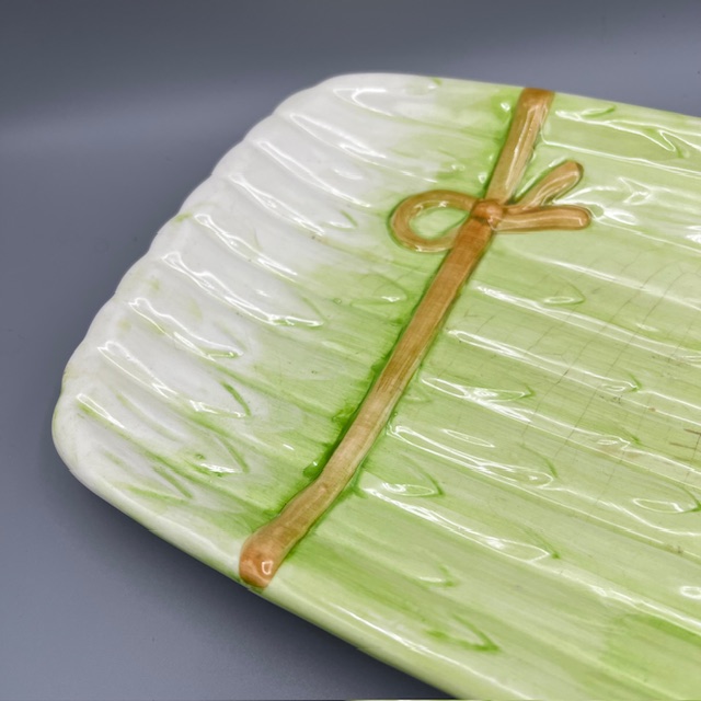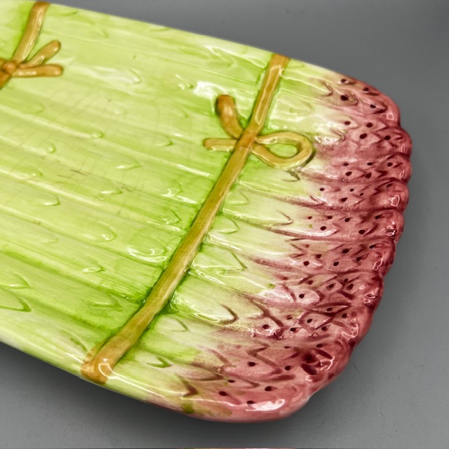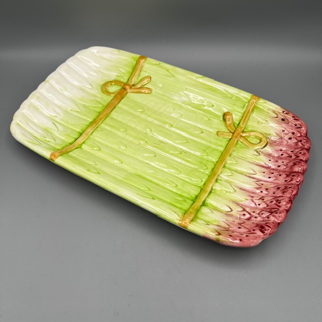 Ce plat à asperges en barbotine séduit immédiatement par son charme délicat et son esprit décoratif typiquement français. Il met en scène un relief finement travaillé qui imite avec réalisme les asperges, tout en conservant une élégance douce et poétique. Les nuances subtiles de vert et les détails en trompe-l’œil apportent du relief.
