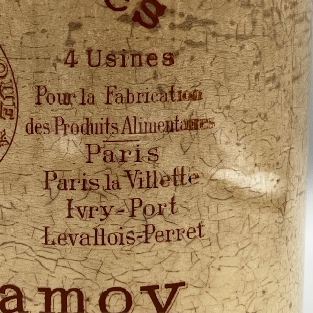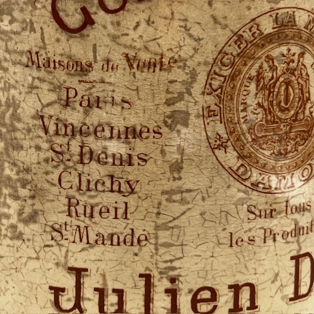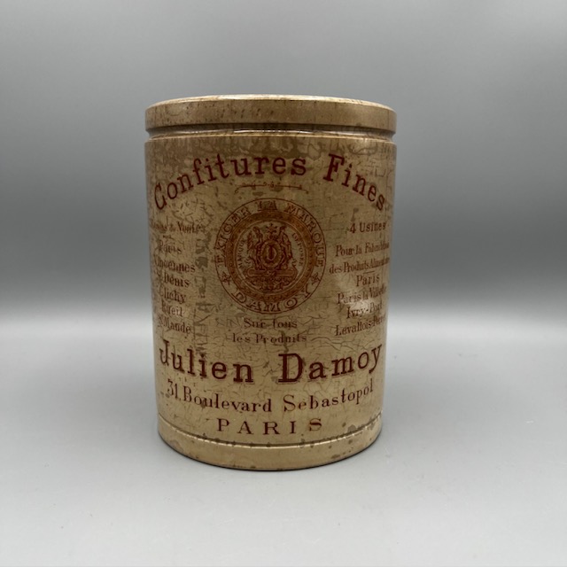 La maison Julien Damoy développe au début du XXe siècle un réseau important d’épiceries modernes. Elle propose des produits conditionnés et standardisés, à l’image de ce pot destiné aux confitures. Elle s’inscrit dans l’évolution du commerce alimentaire en France, aux côtés des grandes enseignes de l’époque.