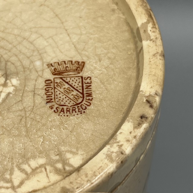 Ce pot à confiture ancien Julien Damoy illustre parfaitement l’esthétique des grandes épiceries parisiennes de la Belle Époque. Il date des années 1900 et provient d’une fabrication en faïence signée Faïencerie de Sarreguemines, reconnue pour la qualité de sa production.