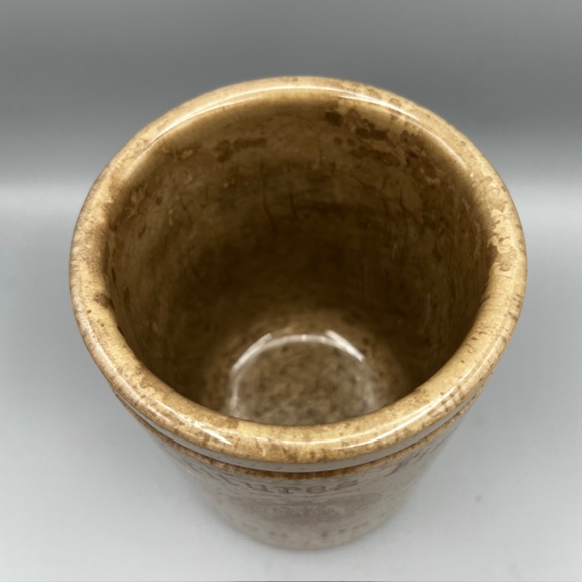 Ce pot ancien s’intègre facilement dans une décoration de cuisine ou dans un intérieur de style campagne chic. Il attire les amateurs d’objets publicitaires et les collectionneurs de céramique ancienne.