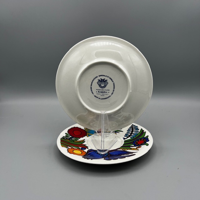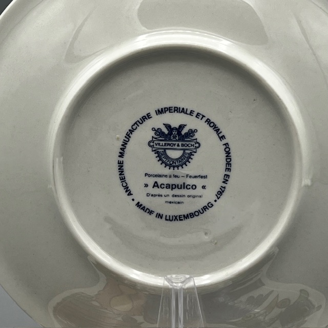 Ces sous-tasses portent l’estampille bleue « Villeroy & Boch – Acapulco – Made in Luxembourg », utilisée principalement dans les années 1970 à 1980, ce qui confirme leur authenticité et leur belle patine du temps.