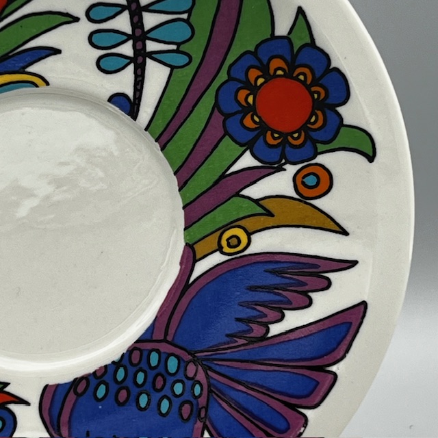 Apportez une touche de couleur vintage à votre table avec ce charmant duo de sous-tasses issues de la célèbre collection « Acapulco » de la maison Villeroy & Boch. Inspiré par l’art folklorique mexicain, ce modèle emblématique des années 1970 séduit par ses motifs floraux et d’oiseaux vivement colorés, typiques du design joyeux et expressif de l’époque.
