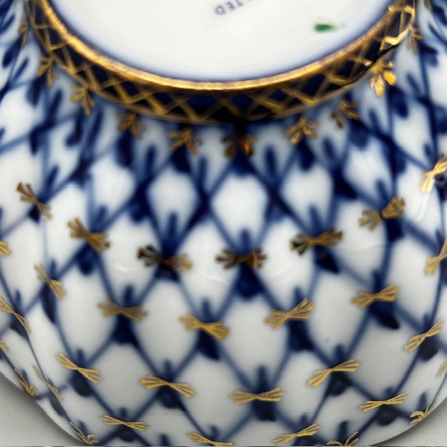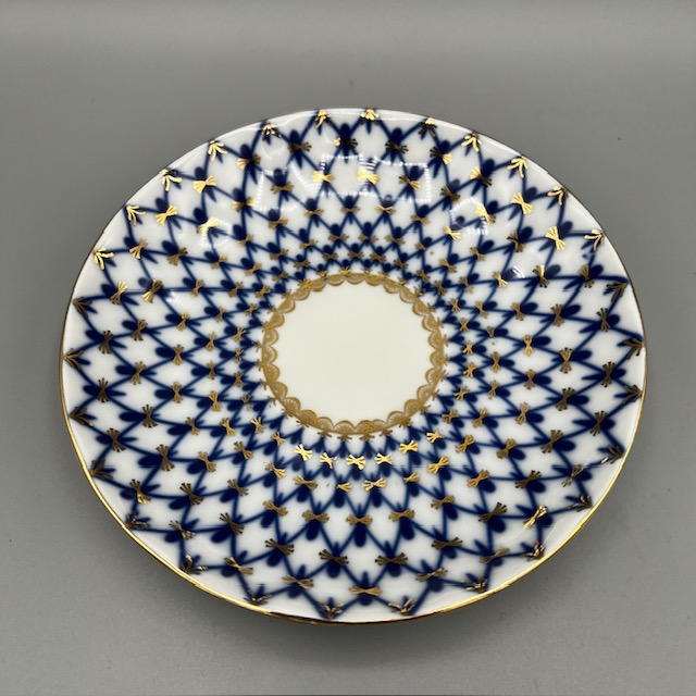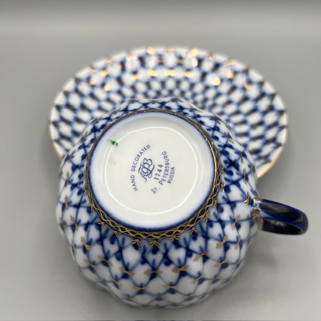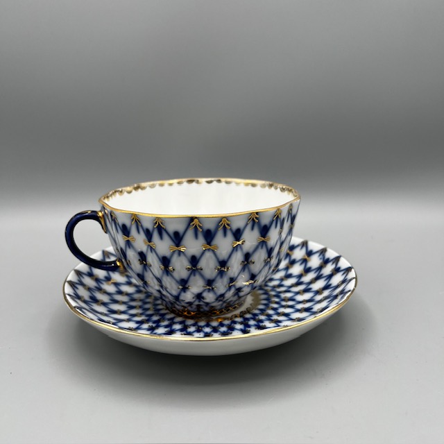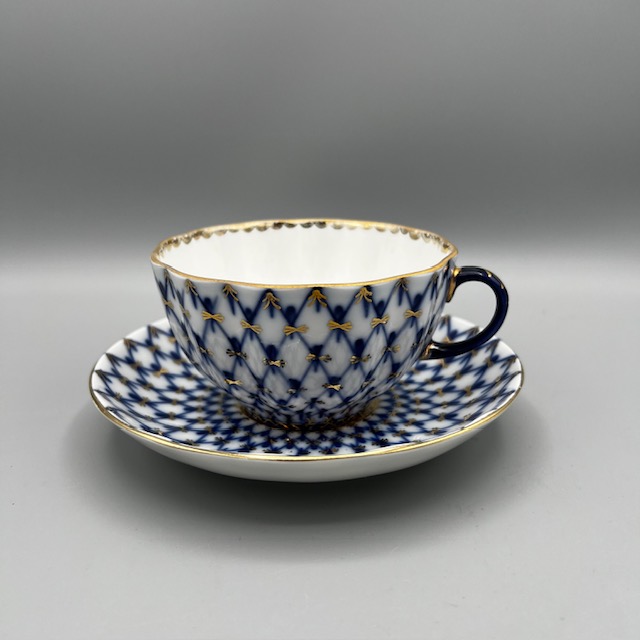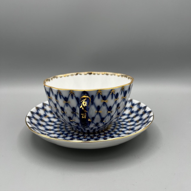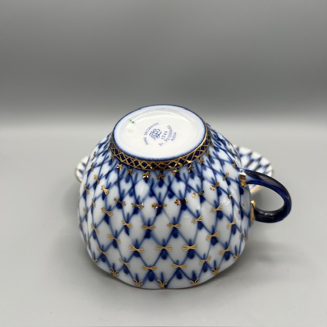 Cette tasse à thé en porcelaine russe illustre l’élégance classique des arts de la table d’Europe de l’Est. Les artisans décorent chaque pièce à la main et appliquent un motif bleu cobalt délicat sur une porcelaine blanche lumineuse. Le décor forme un treillis fin et régulier qui rappelle les grands modèles traditionnels de la porcelaine de Saint-Pétersbourg. De légères touches d’or soulignent les contours et apportent une note précieuse à l’ensemble. La tasse repose sur sa soucoupe assortie.